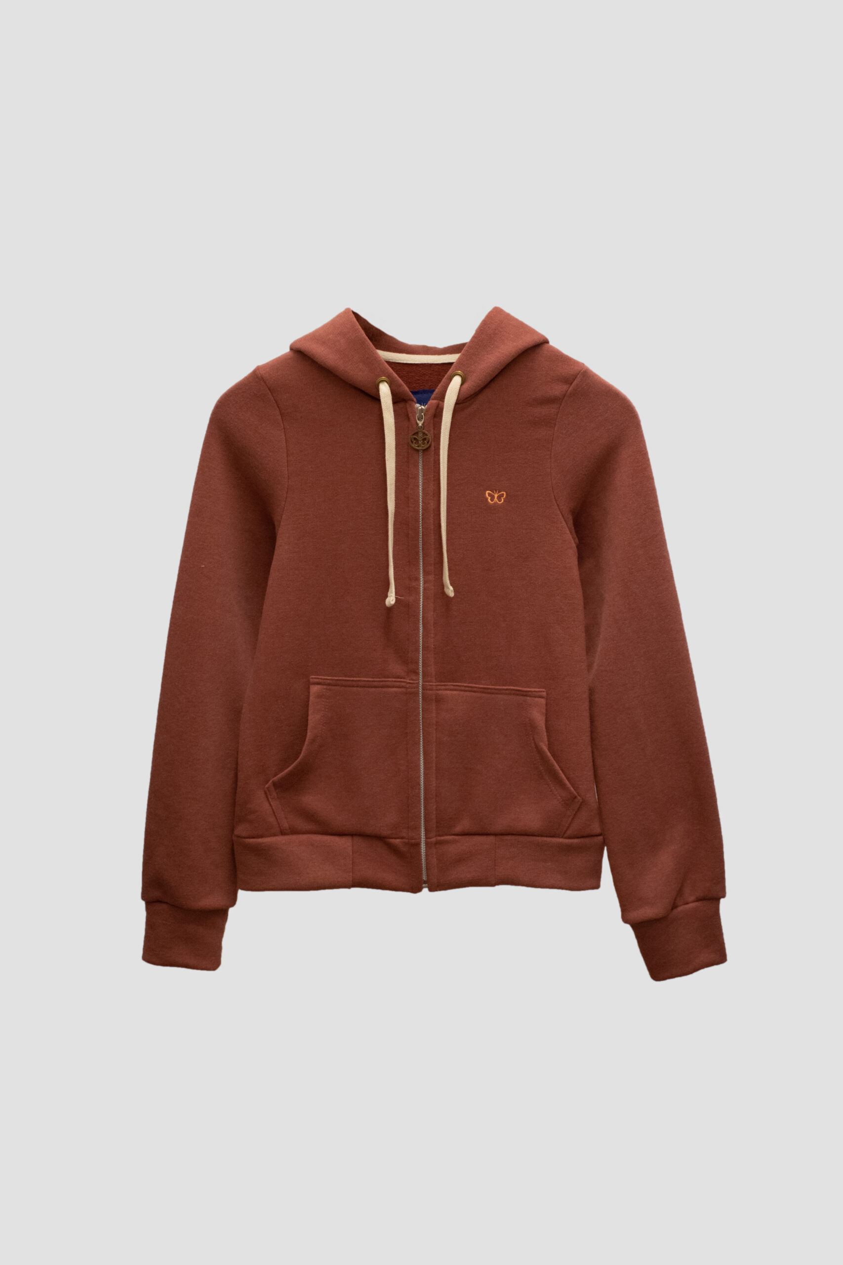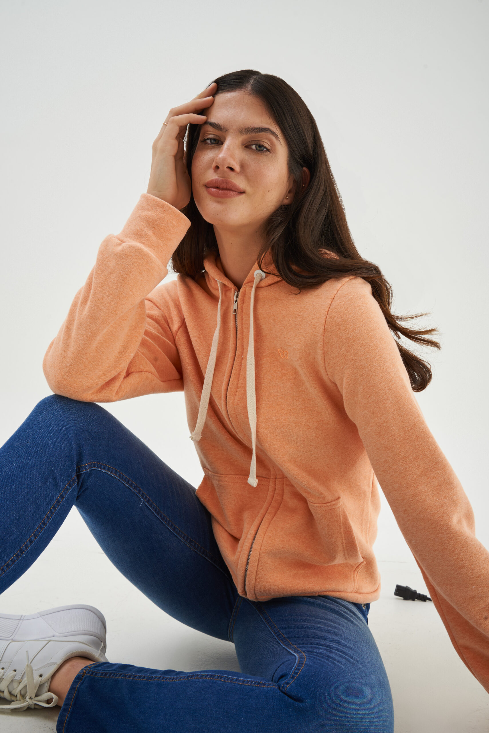 Campera con cierre frontal, capucha y cordones ajustables.