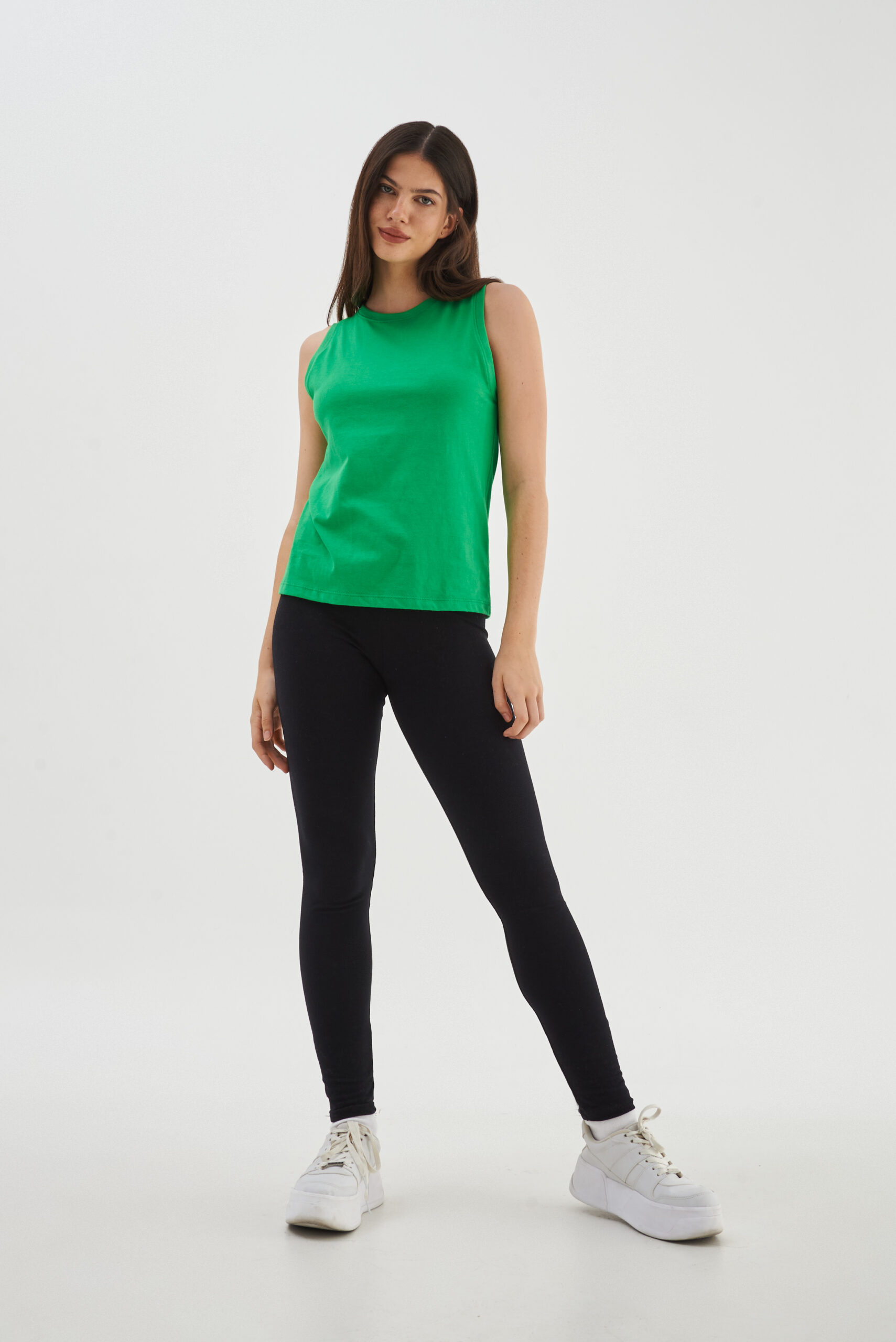 Calza básica tiro alto con elástico embutido de algodón con lycra.