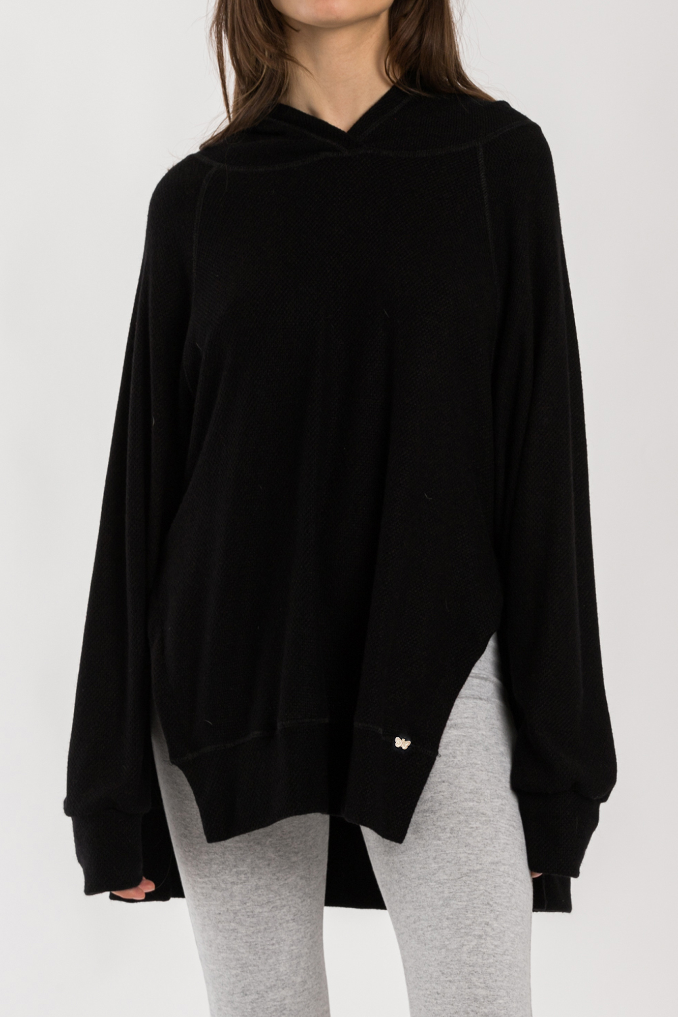 Buzo holgado con capucha y mangas ranglan. Detalle de recorte al bies en el bajo delantero.