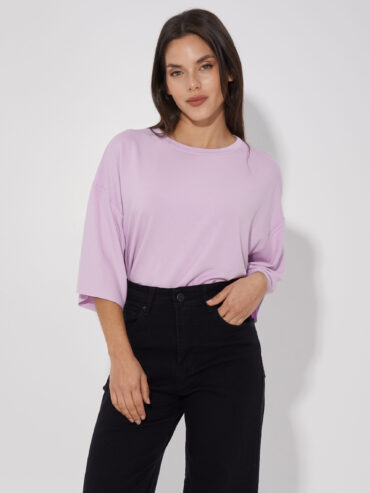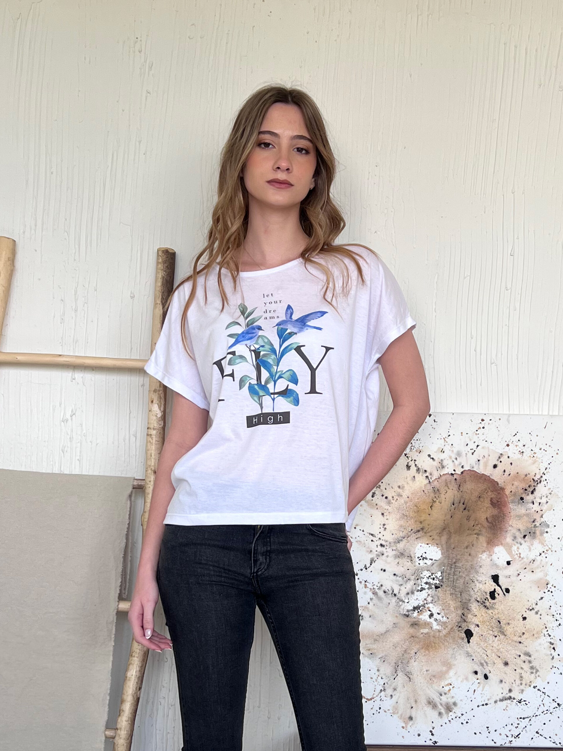 Remera holgada con cuello redondo, hombros caídos y bajo recto. Detalle de estampa en el delantero.