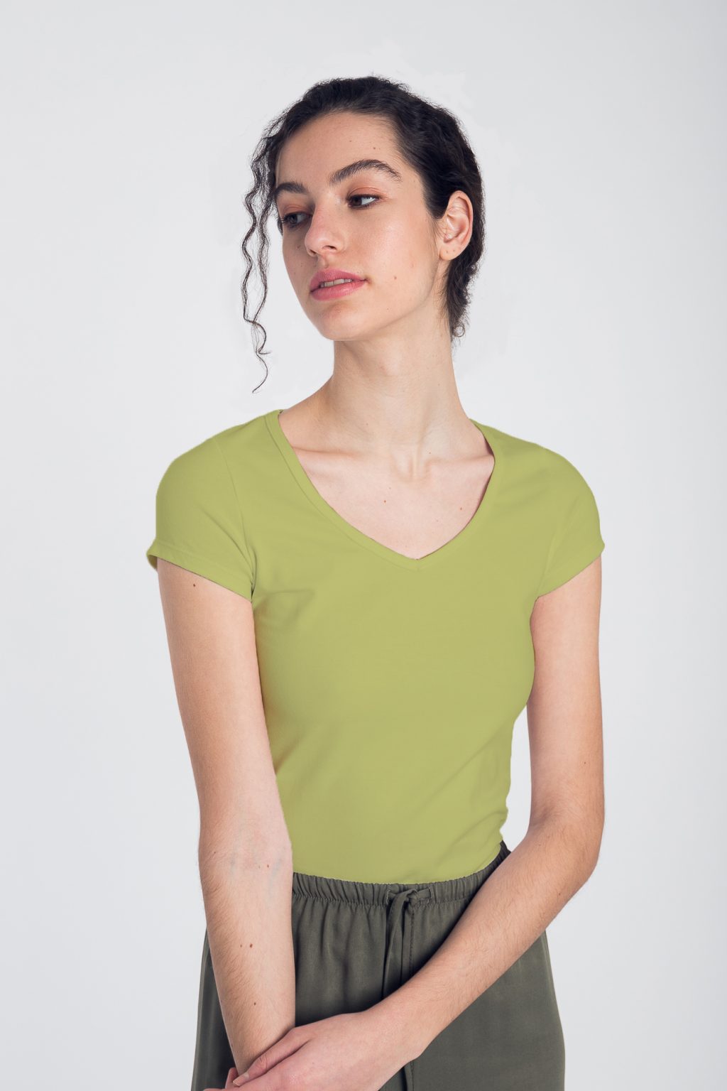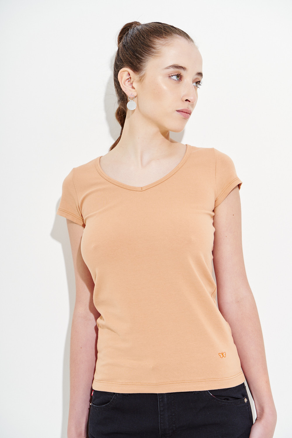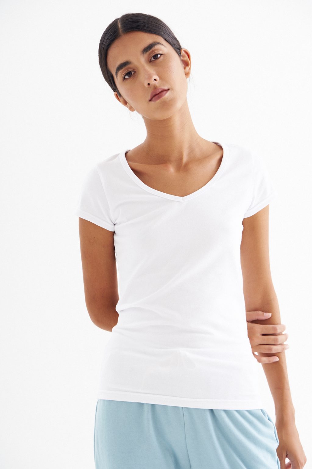 Remera básica de escote V y silueta entallada. Bajo recto y largo hasta la segunda cadera.