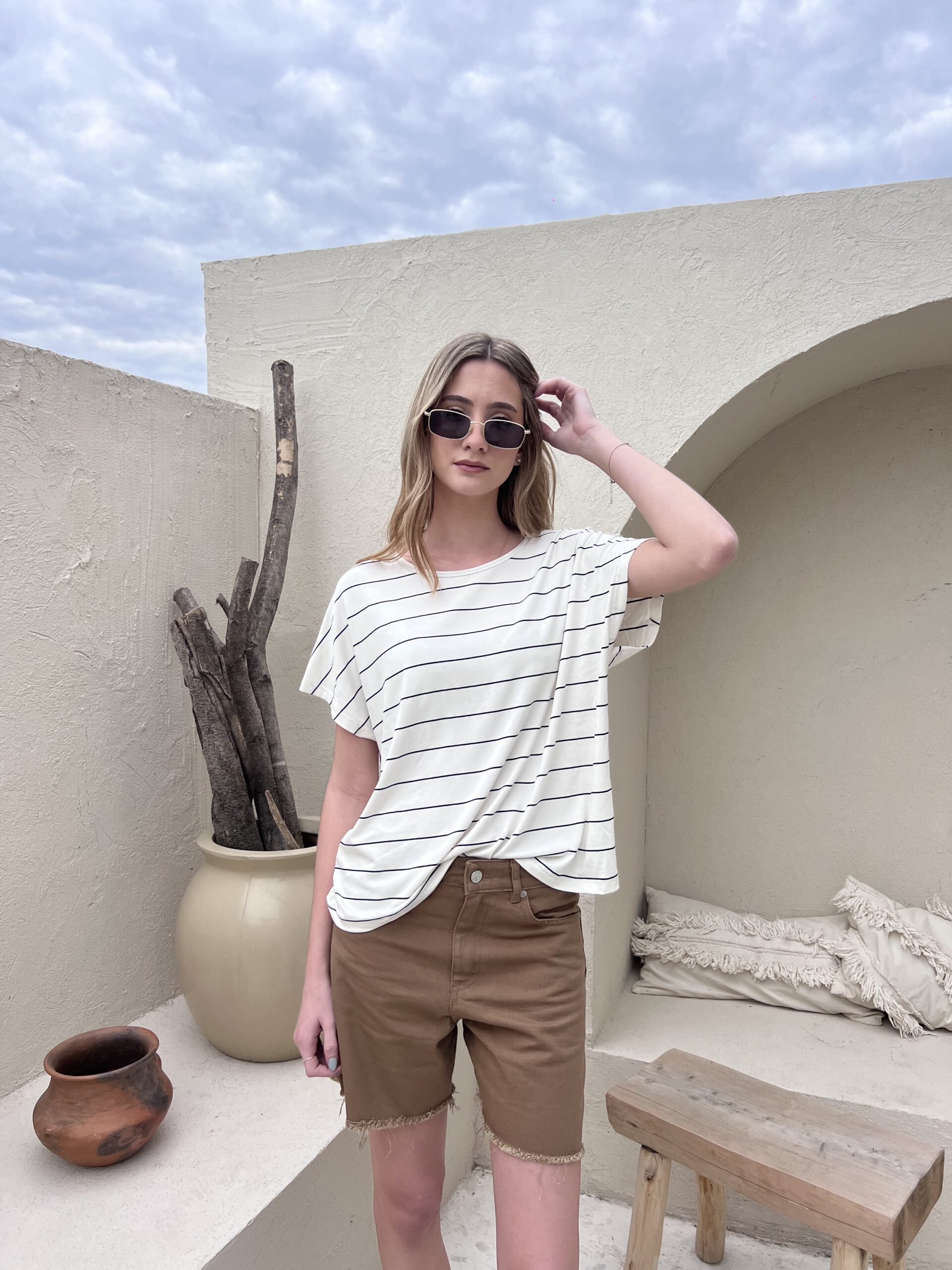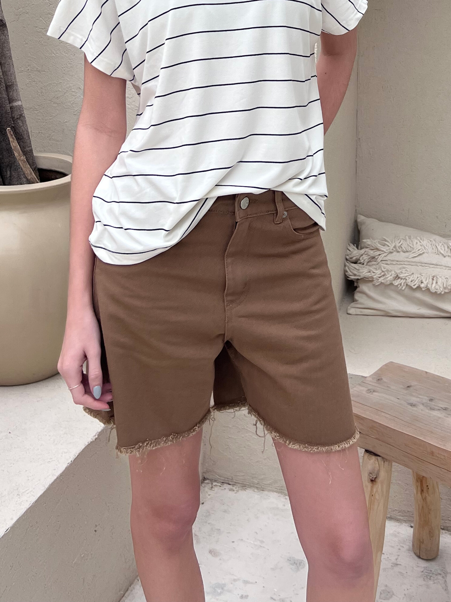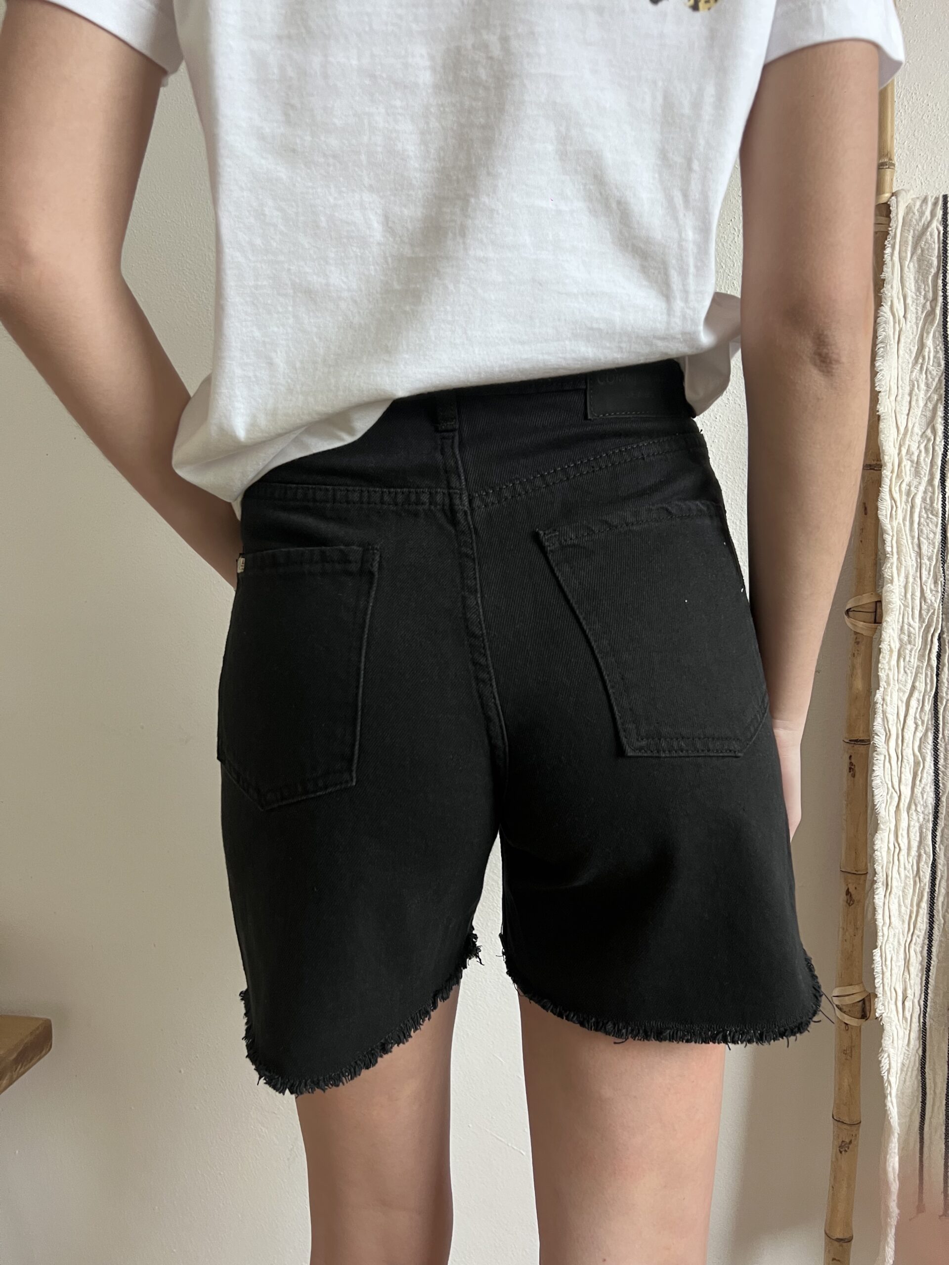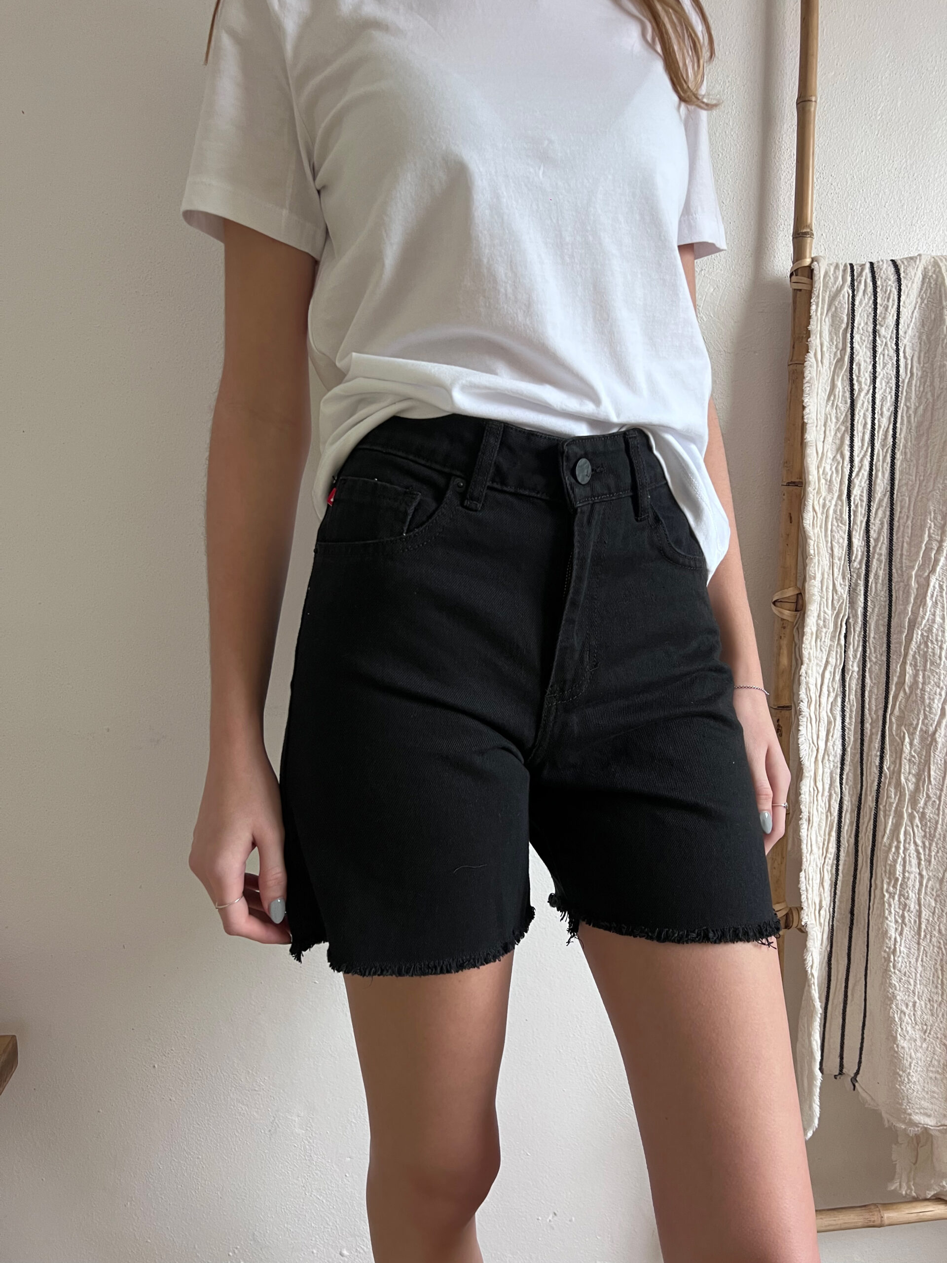 Short de cinco bolsillos, tiro alto con cierre y botón. Bajo desflecado.