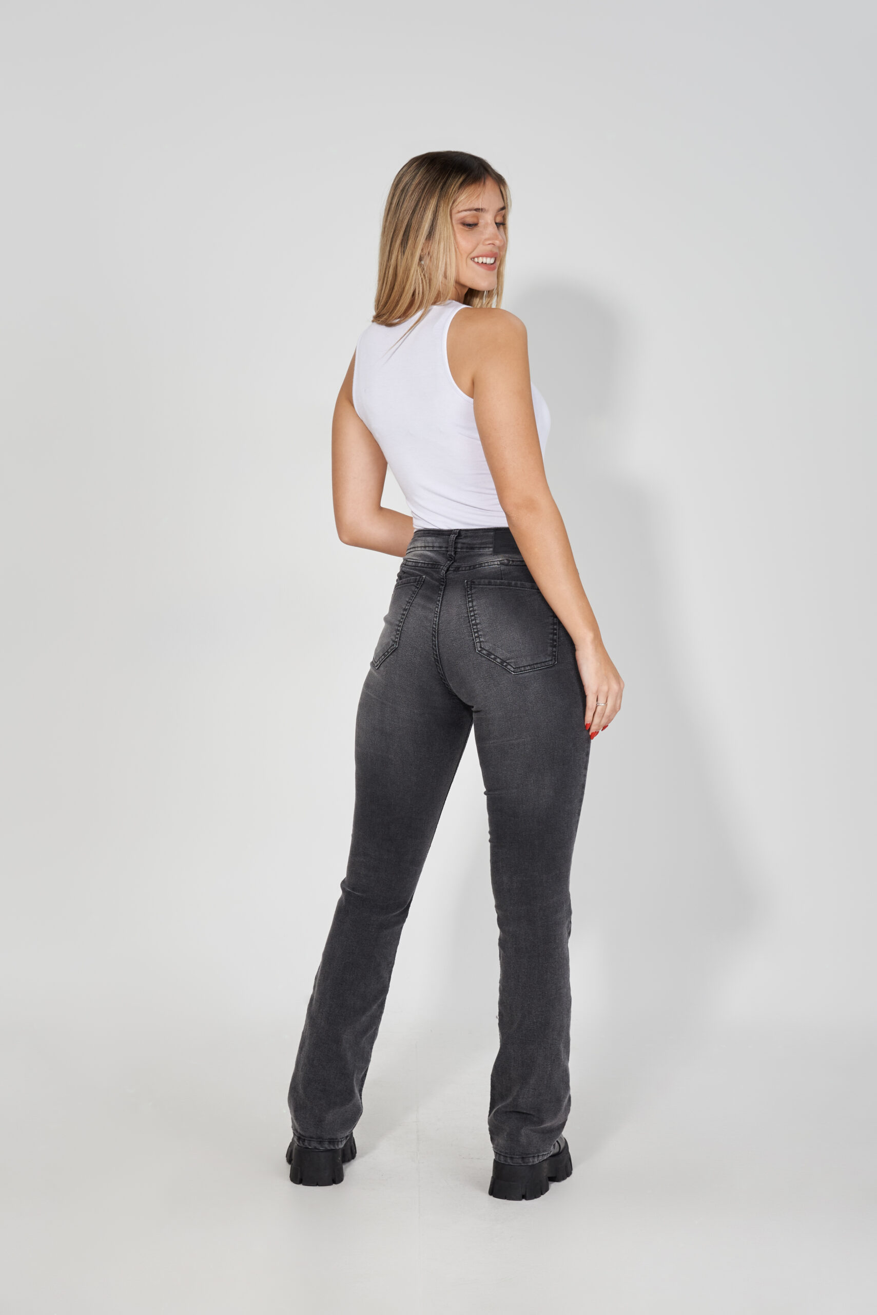 Jean semioxford tiro medio con cinco bolsillos, cierre frontal y botón metálico. Lavado Stone 7%