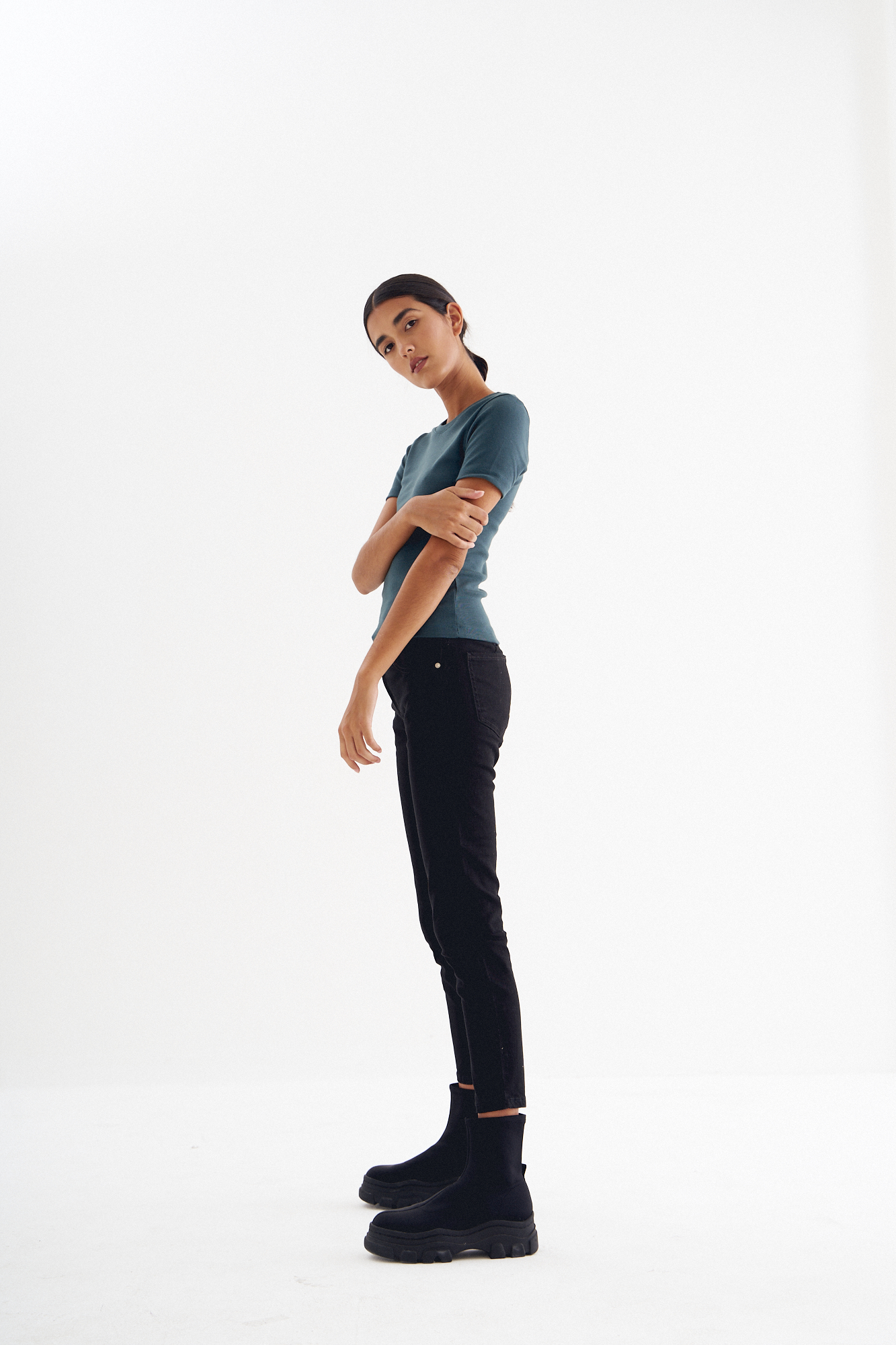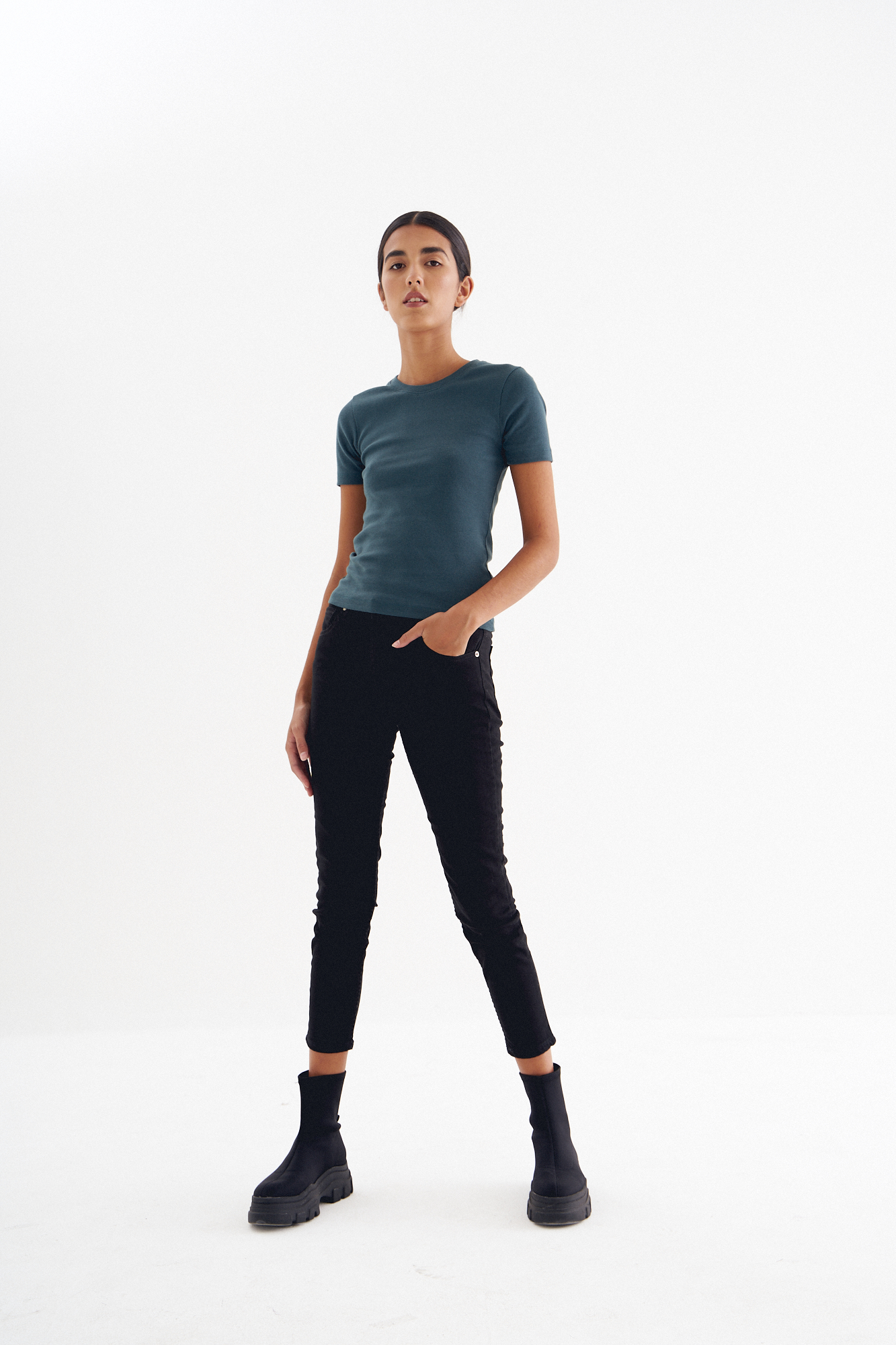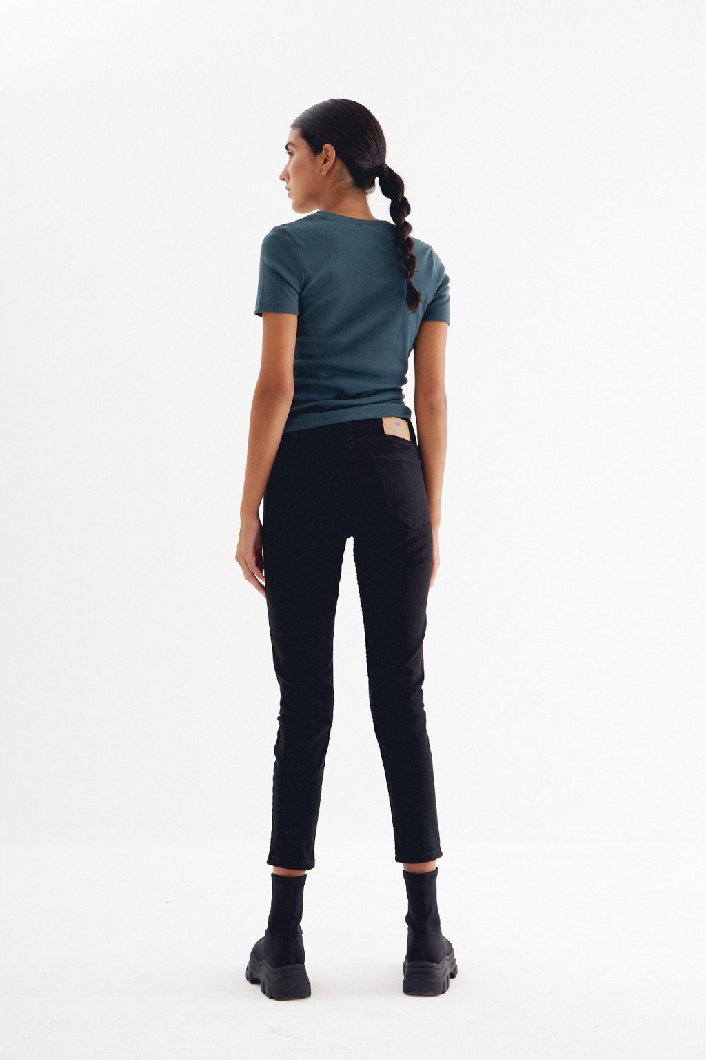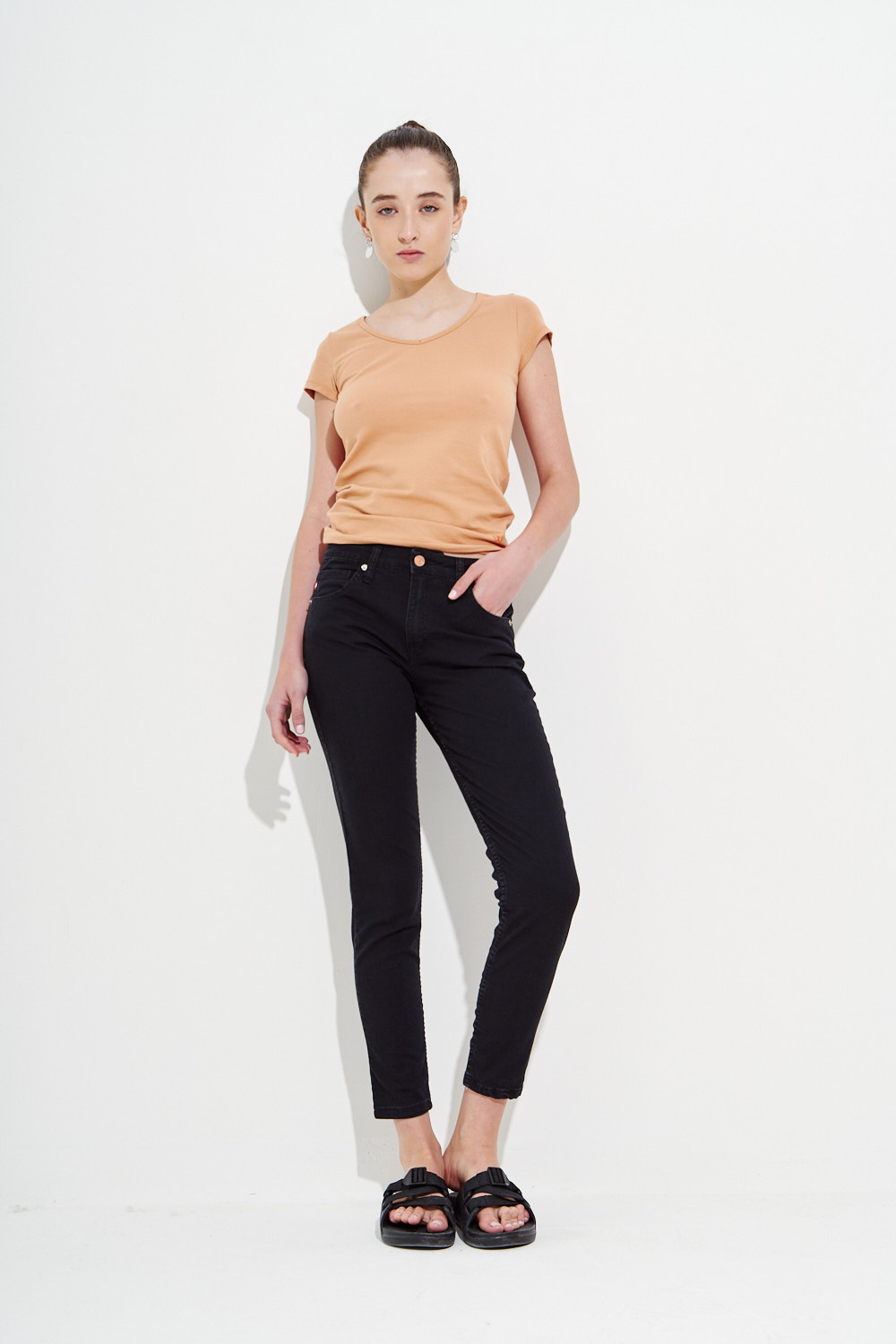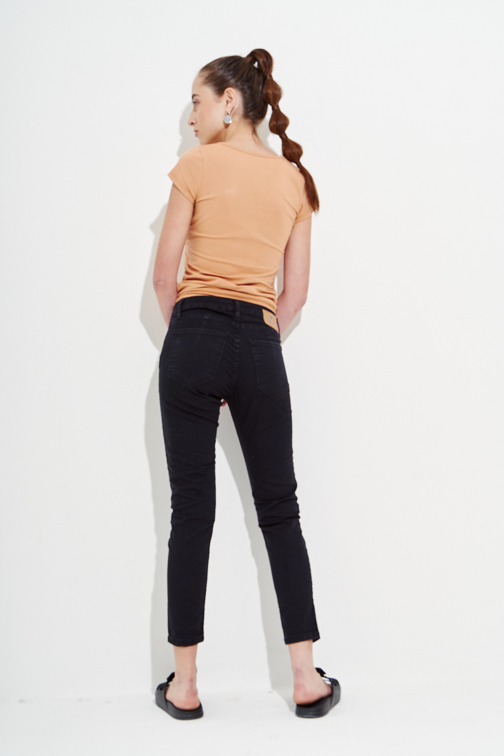 Skinny jean tiro alto con cinco bolsillos. Cierre frontal con cremallera y botón metálico.