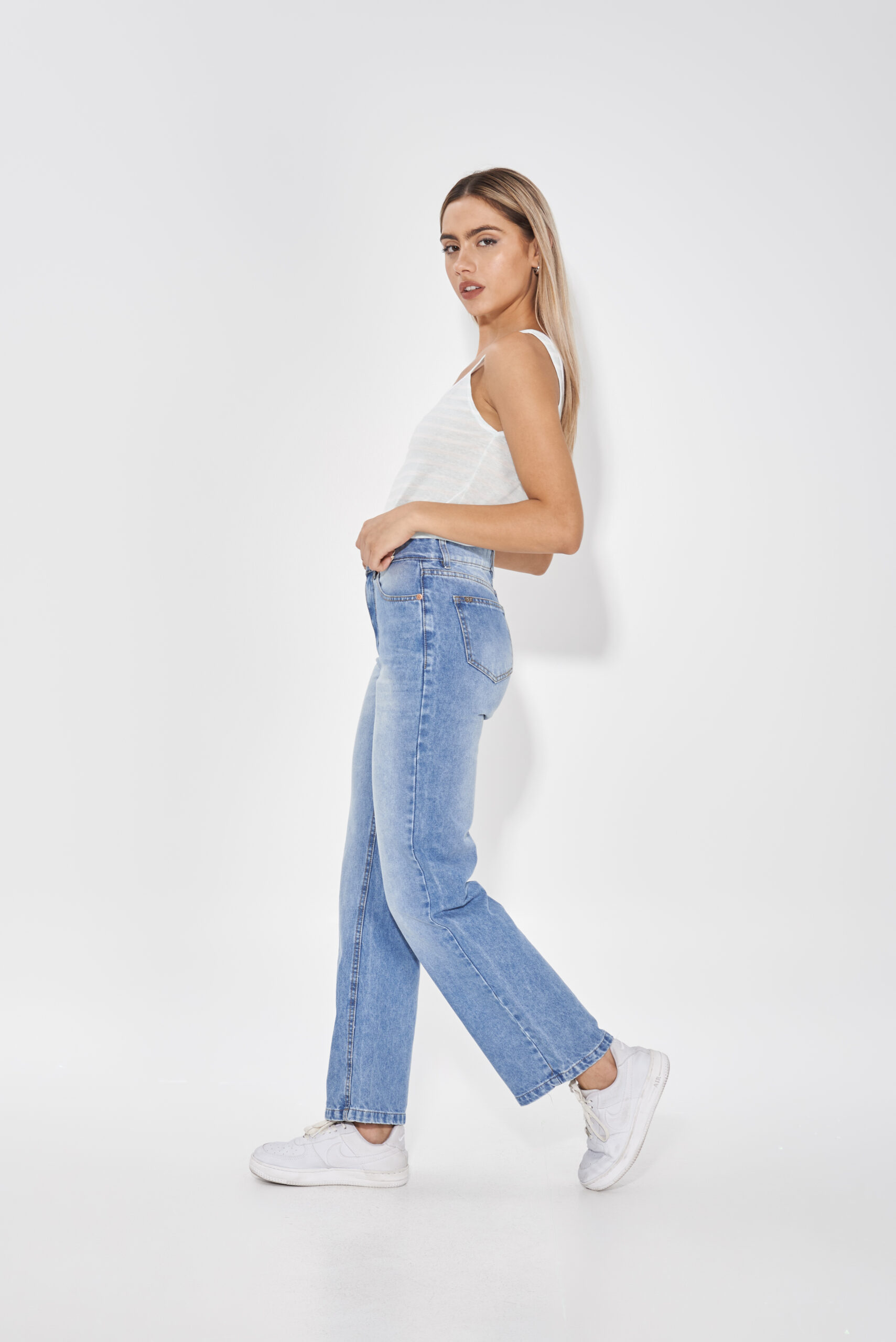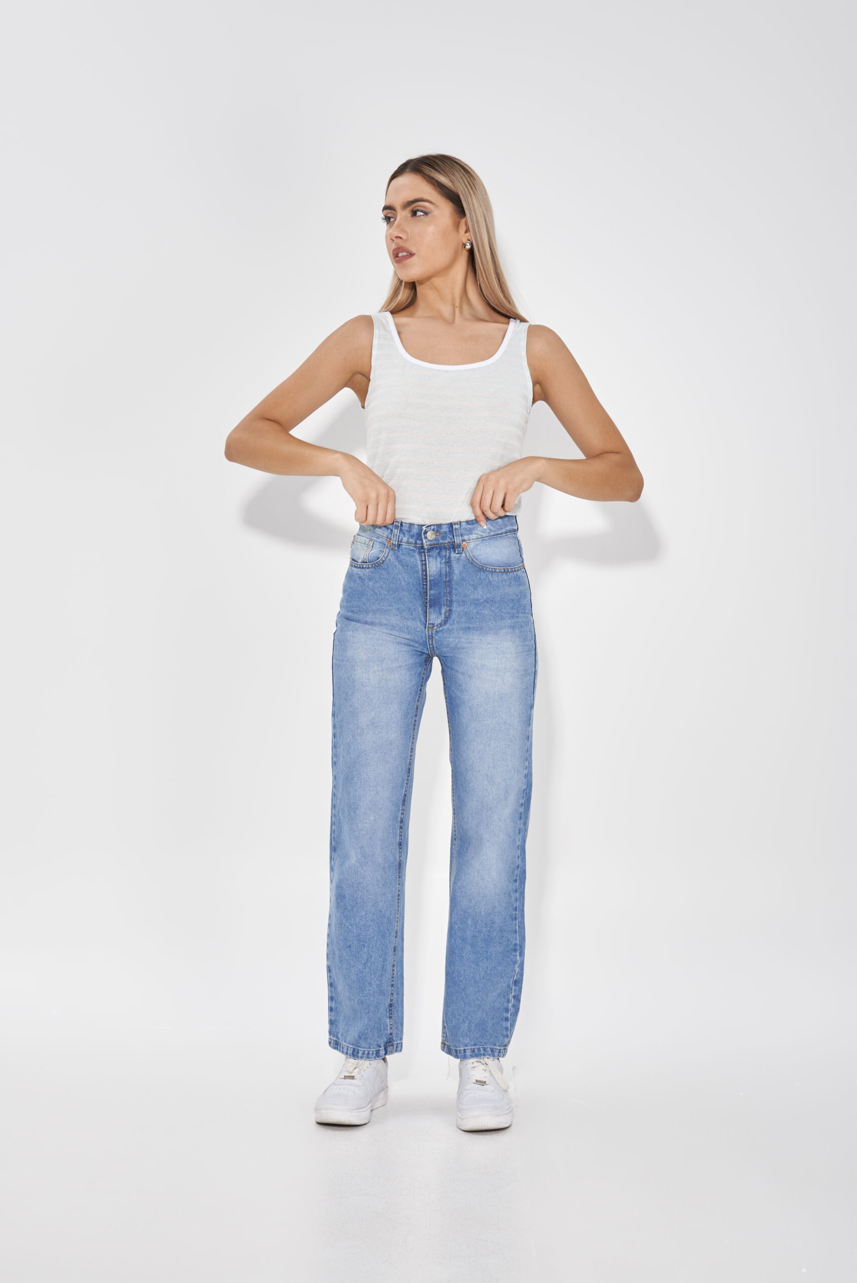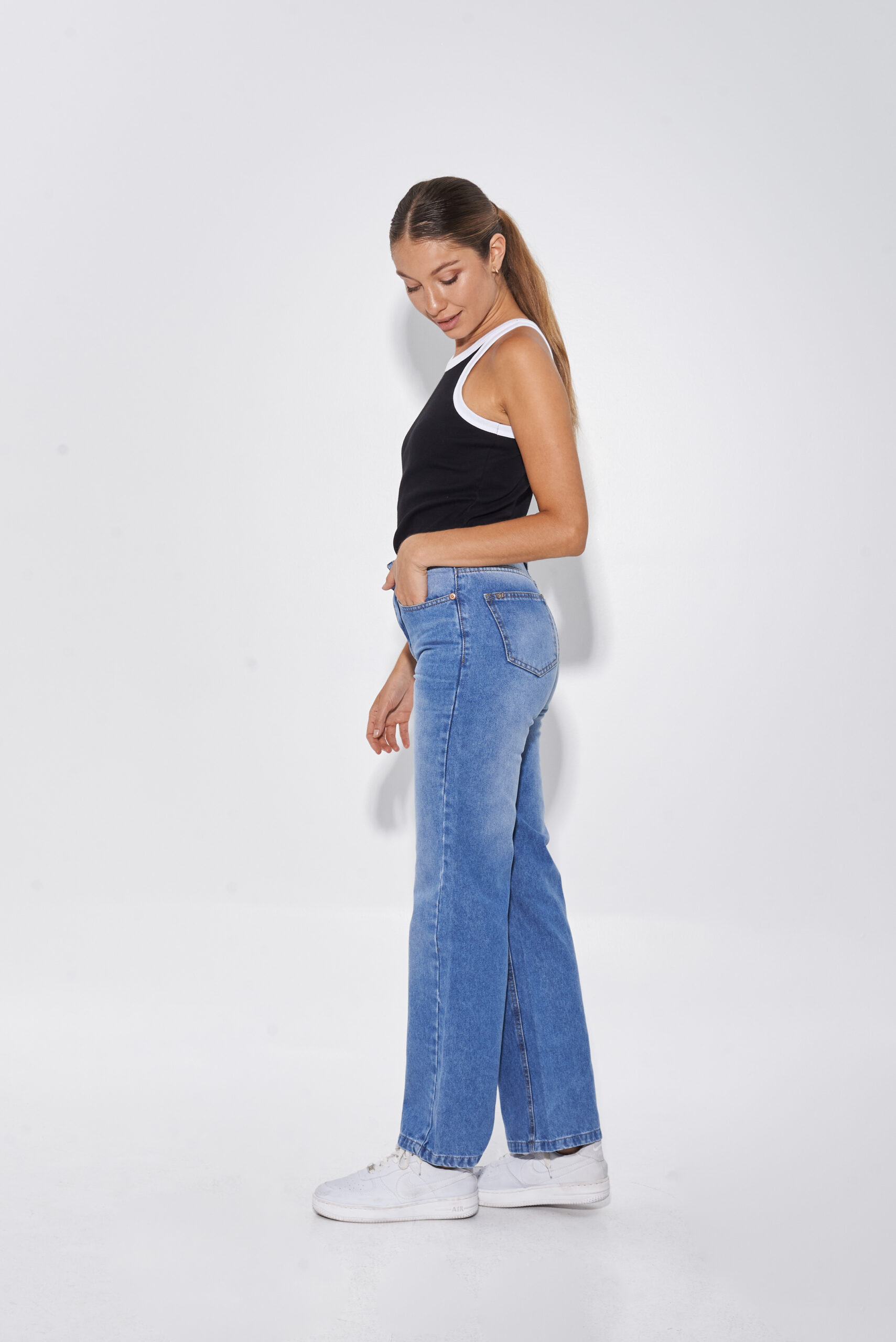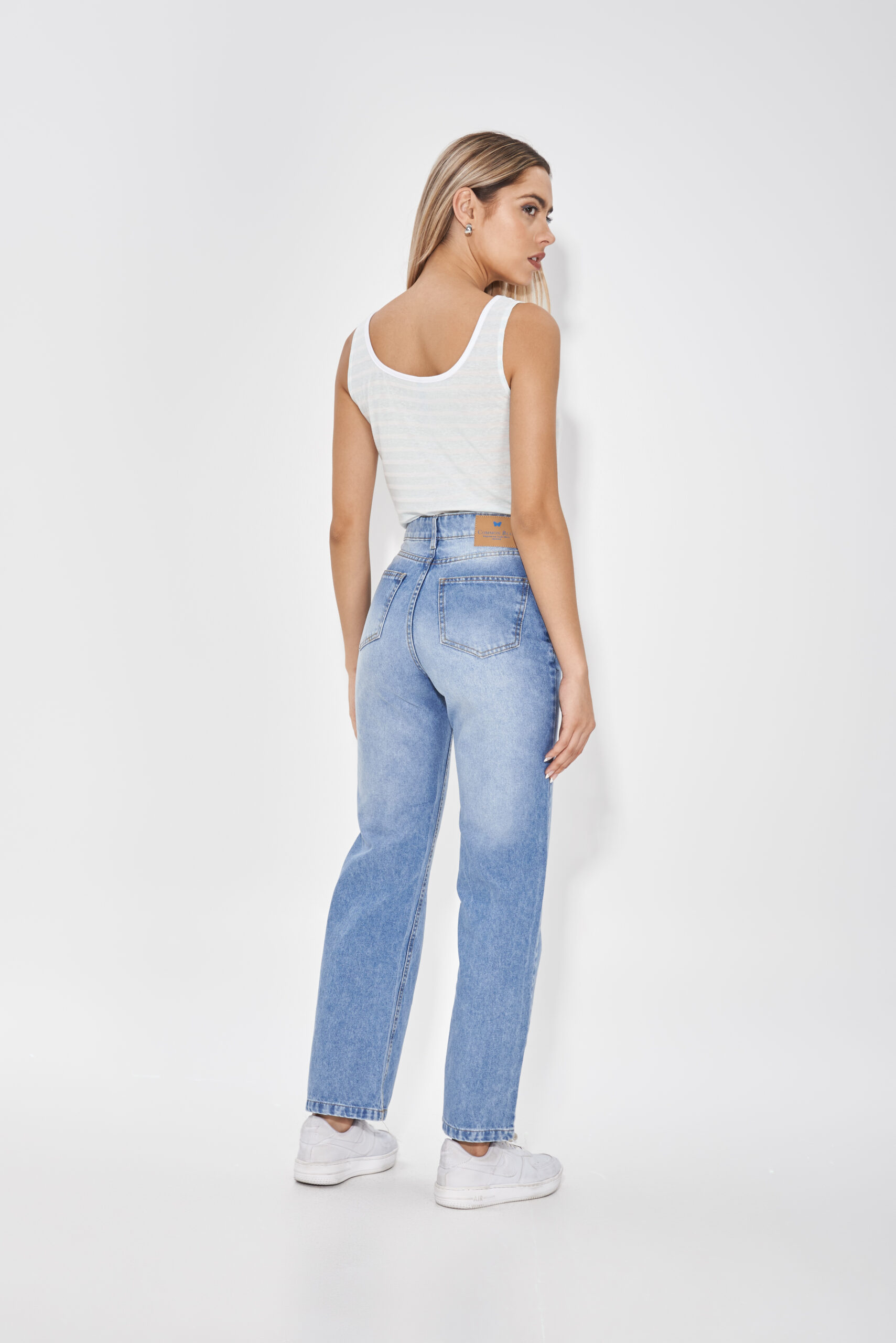Jean recto tiro medio con cinco bolsillos, cierre frontal y botón metálico. Lavado Stone 7%.